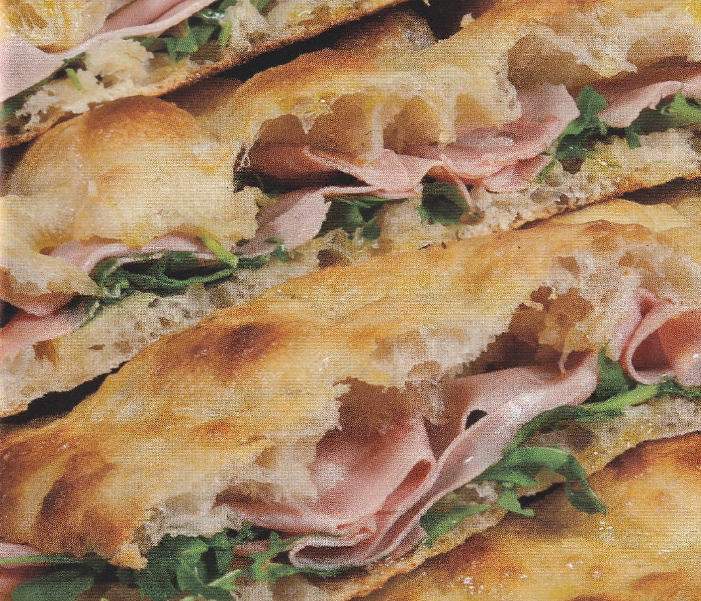 Panuozzo avec mortadella + pesto + stracciatella + tomates cerises + roquette